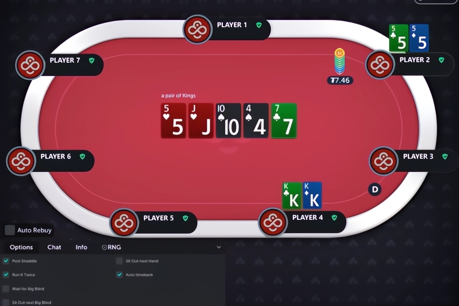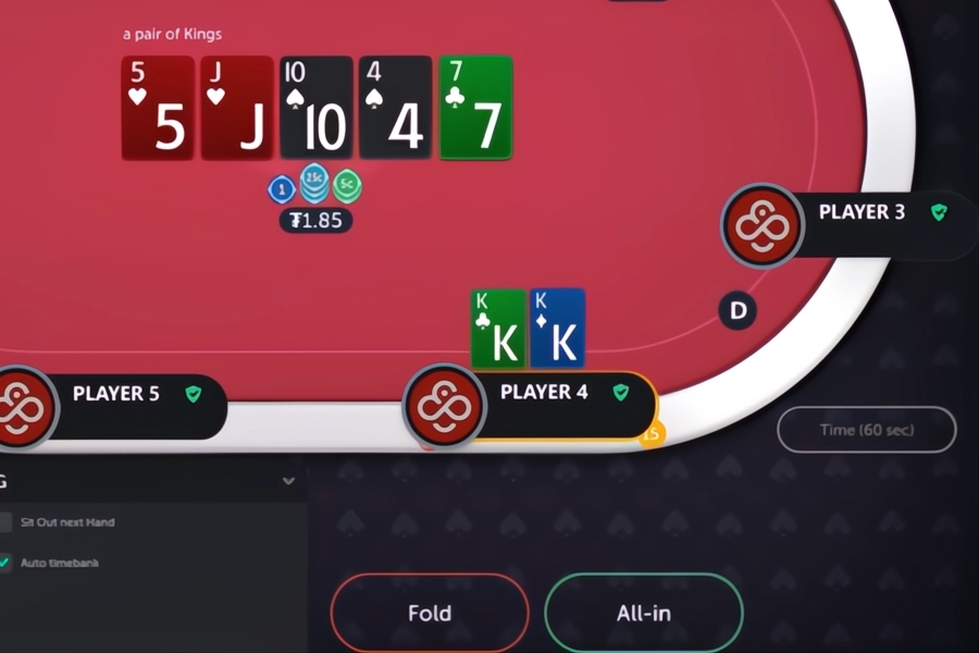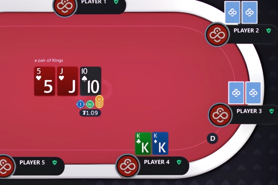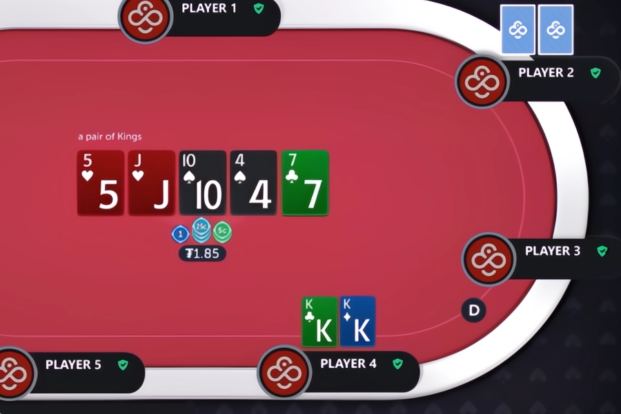 Image: Player 4 calls, and their pair of Kings loses to the set of Fives from Player 2.