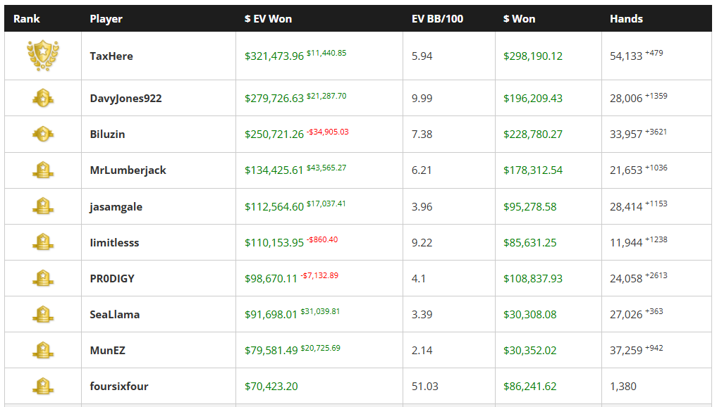 TaxHereがトップの座を取り戻した ハイ ステークス キャッシュ ゲーム ワールド チャンピオンシップ 123,613ドルのセッション後。 これにより彼の合計は $EV 獲得 に $321,473。 DavyJones922 も僅差で続いています $279,726.