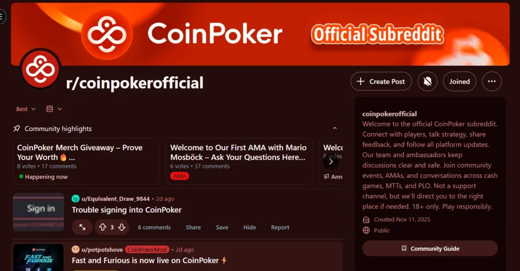 CoinPoker의 공식 Reddit 페이지 호스팅됨 마리오 모스복(Mario Mosböck)의 AMA 11월 말부터 독점 상품을 배포하고 있습니다. 12월 1일부터 12월 15일까지.