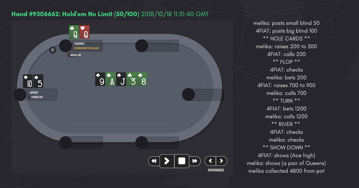 This hand comes up in a heads up 50/100 and I’m playing “4FIAT”. I open-raise 3bb with QcQh from the button, and “4FIAT” defends his big blind.