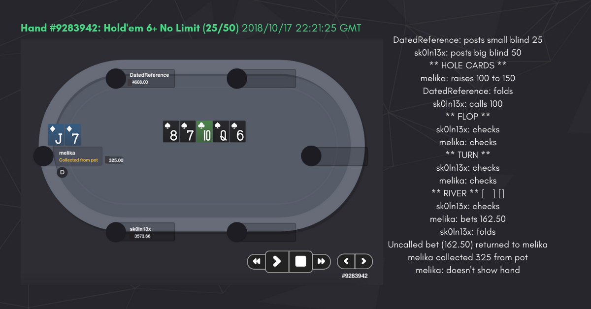 Small blind folds, and “Skolnlex” in the big blind calls my 3x open raise. The flop is 87Tssc and I check (I only have a bottom pair and a gutshot). I’ve got a little bit of showdown value already, and there’s no reason to build a big pot or to bluff.