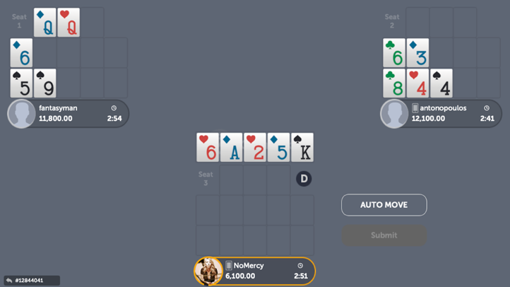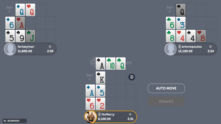 Being last to act and seeing the cards that my opponents have revealed, this is a pretty standard opening for the Ace and the King. Indeed, the Ace will go in the middle for sure, and the King will go on top. As for 6-5-2, I decided to be a little creative and to start chasing down a flush on the bottom row with 6-2 of heart. This play may be debatable, but this will be the subject of another column. Right here right now, I saw that the sixes were almost dead, but that a lot of hearts were remaining in that deck, so I decided to go this way, knowing that I could still change my plan and make trips deuces on the back, or why not quads! I can always abandon my flush as well and settle down for two pairs on that line.