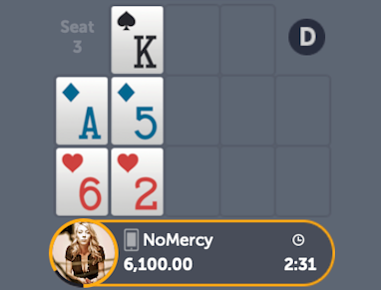 If I had been more careful, I would have placed a live 10 on top, knowing that apart from the pair of Kings I am pursuing, the only other pair that will give me more points than 10s would be Jacks. And since there are still 3 Jacks live in the deck, I can always use them to make two pairs or trips on the back, should I abandon my flush draw.