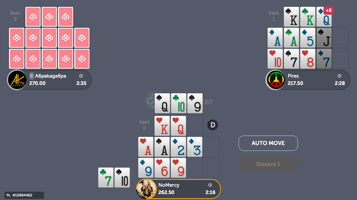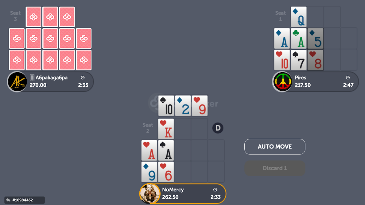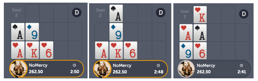In this particular case, I chose to place the 3 in the middle, thinking that if I did not catch my 6 or my 9 on the next draw, I will still be able to place another card on the back line to make my two pairs: