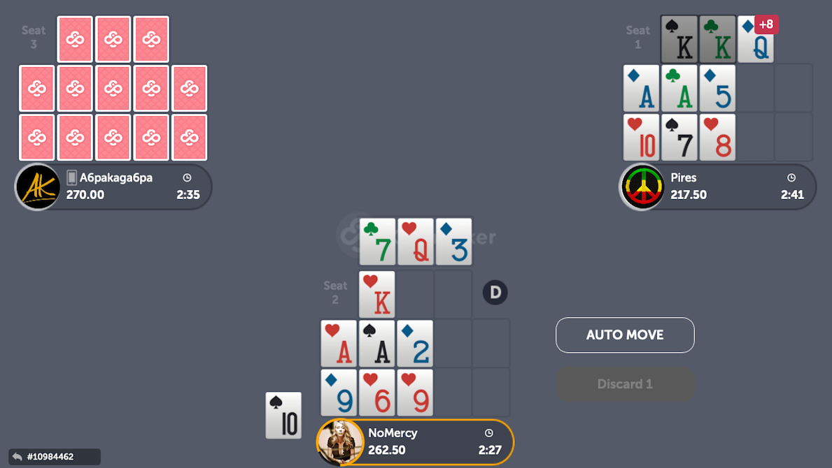 In this context, the 9 will go on the back for sure, since this drastically improves our hand. As for the other card, and because Pires is already showing a 10 on his board, we will prefer to use the deuce.