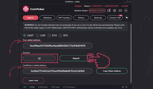 - Deposit USDT, CHP, BTC or ETH from your personal crypto wallet to your CoinPoker account
