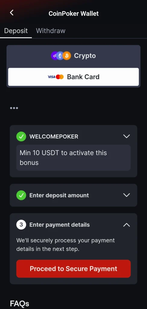 我們快速的提存系統能夠即時且安全地處理加密貨幣交易。在某些地區,我們也支援銀行卡和電子錢包。