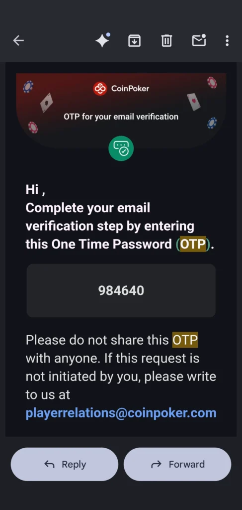 CoinPoker 會發送一個 6 位數的驗證碼給您。請記住該驗證碼,回到應用程式中,並輸入該代碼以驗證您的電子郵件。