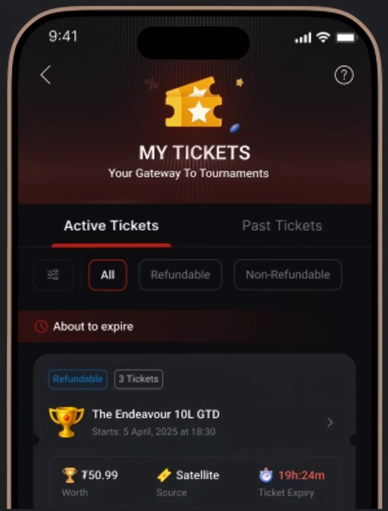 在這裡,您可以查看您的可用門票、有效門票、過往門票、使用歷史紀錄,並瀏覽符合條件的真錢撲克錦標賽。