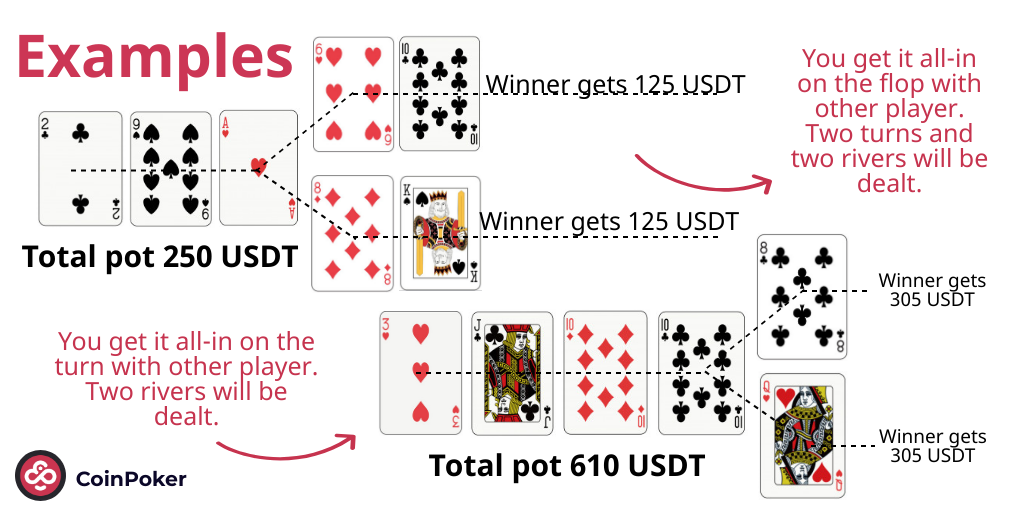 在此情況下,獎池將按 50%/50% 的比例分配。若牌桌中僅剩兩名玩家,根據最終結果,一名玩家可能贏得兩輪(初始底池的 100%)、贏得一輪(初始底池的 50%),或兩輪皆未獲勝。